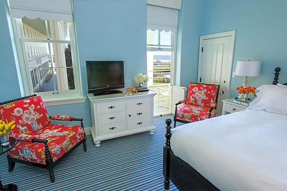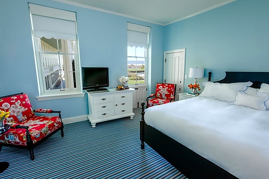 This ocean view room offers 2 plush bathrobes, flat-screen TV, a mini chiller, complimentary WiFi and local Beach Plum bath amenities. These rooms have views of the Atlantic Ocean, the seasonal outdoor pool and the front lawn of Congress Hall.